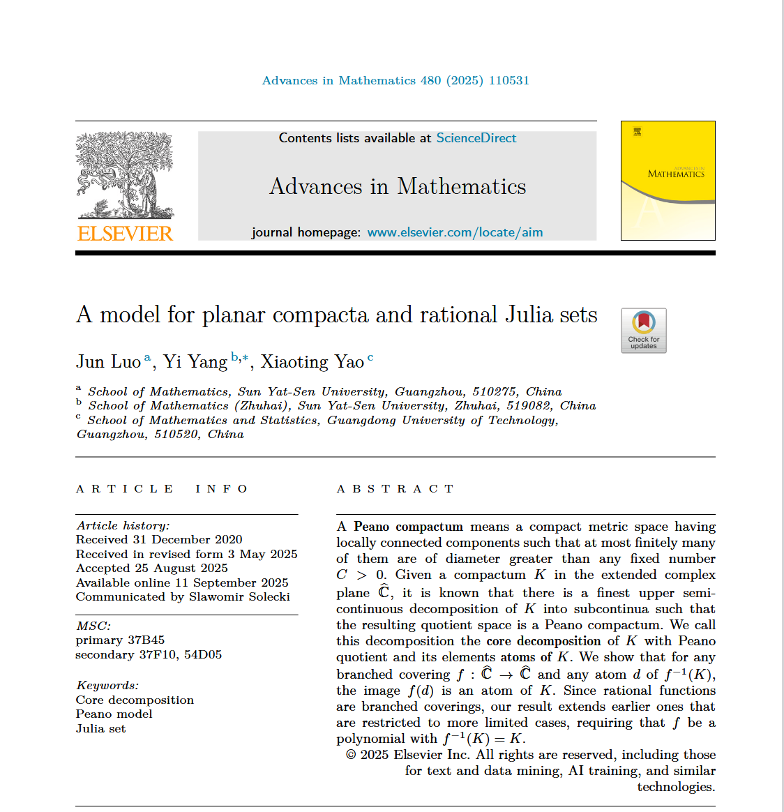 近期,我校数学与统计学院教师姚晓婷与中山大学数学学院罗俊教授,中山大学珠海校区数学学院杨毅助理教授在平面紧集的Peano模型理论研究中取得重要进展,相关研究成果以“A model for planar compacta and rational Julia sets”为题,发表在国际著名期刊《Advance in Mathematics》上(署名按作者姓氏字母顺序排列)。论文链接:https://www.sciencedirect.com/science/article/pii/S0001870825004293?via%3Dihub