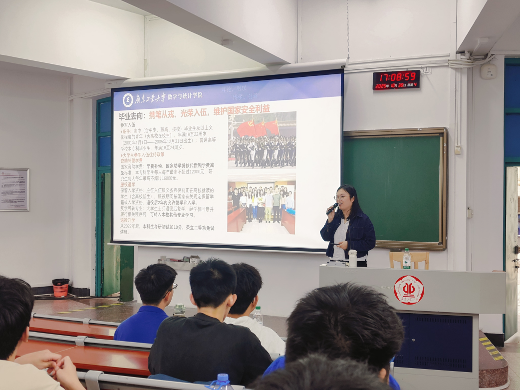 在毕业规划指导部分,李润丽老师系统解读了推免保研、考研、考公考编、就业及征兵入伍等多元化发展路径,深入剖析各类发展方向的竞争态势、关键准备节点与备考策略,以期帮助同学们结合个人兴趣与专业优势,科学定位发展方向。她强调,同学们应尽早树立规划意识,合理统筹时间,夯实能力基础,为未来职业发展做好充分准备。
