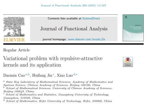 近期,我校数学与统计学院教师贾慧芳与中国科学院曹道民研究员,合肥工业大学罗肖副教授在排斥-吸引混合核的变分问题研究中取得重要进展,相关研究成果以Variational problem with repulsive-attractive kernels and its application”为题,发表在国际著名期刊《Journal of Functional Analysis》上。论文链接:https://doi.org/10.1016/j.jfa.2025.111187.