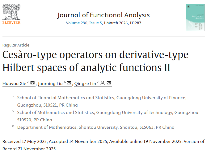 近期,我校数学与统计学院刘军明副教授与汕头大学林庆泽博士,广东金融学院谢华友博士在Cesaro型算子研究中取得重要进展,相关研究成果以“Cesaro-type operators on derivative-type Hilbert spaces of analytic functions II”为题,发表在国际著名期刊《Journal of Functional Analysis》上。